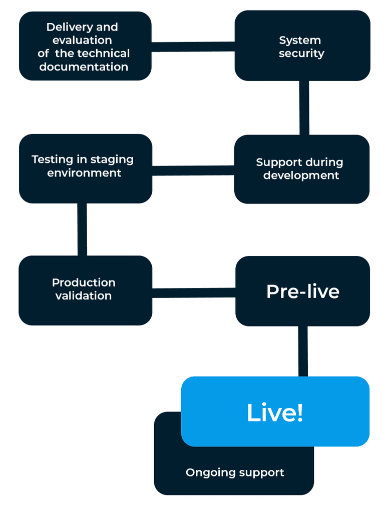 In the next stage, after the client’s security configuration and documentation review, development support begins. Clients initiate the integration development using Caleta's technical documentation, and the process is closely monitored by our development team. Direct communication is maintained to address more complex issues.
