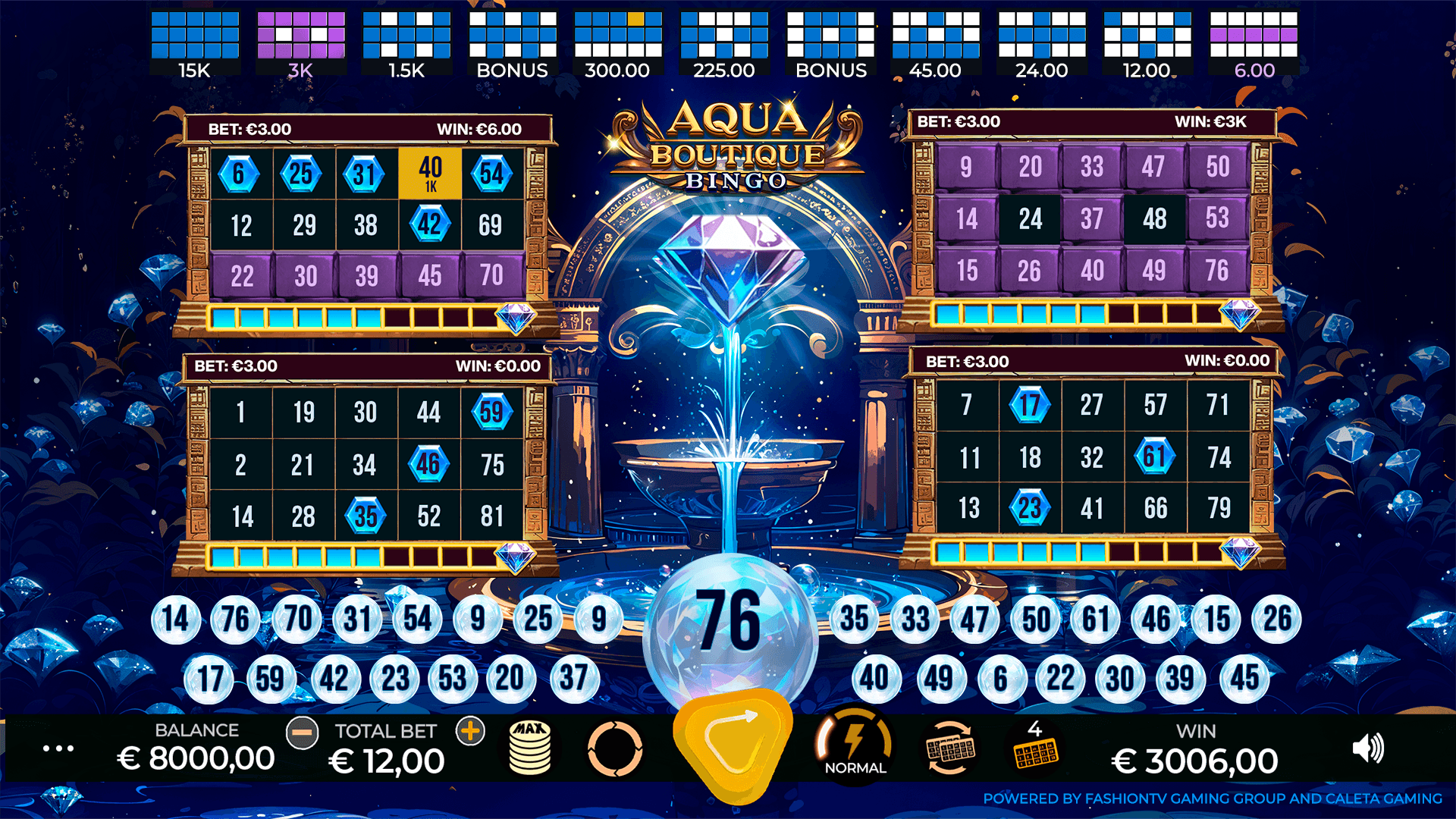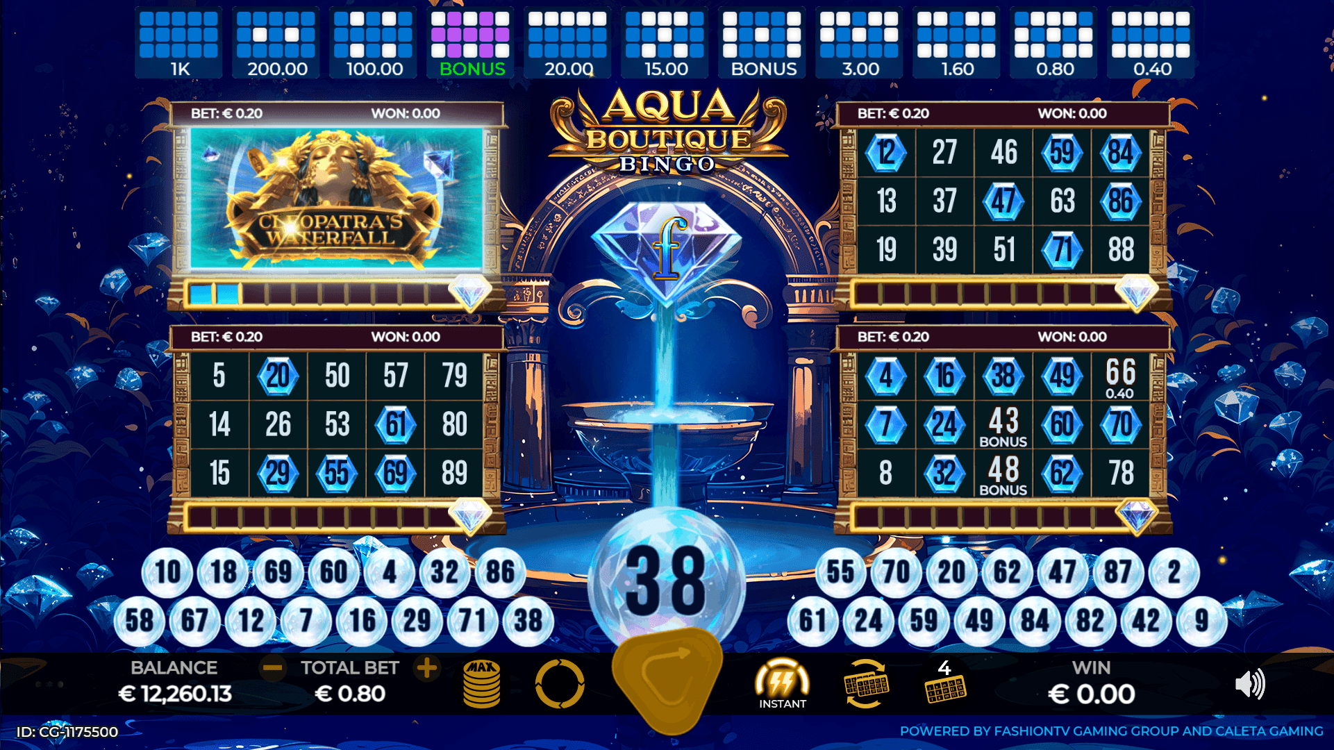 Immerse yourself in FashionTV Aqua Boutique Bingo, where ancient myths meet timeless luxury. Play bingo in a time of legends, with each number a gem drawn from the fountain of fortune. Unlock hidden bonus rounds like Ancient Treasure, where sunken relics await discovery, Stairway to Elysium, a divine journey to endless rewards, and Cleopatra's Waterfall, where the queen’s treasures flow like golden streams. In FashionTV Aqua Boutique Bingo luck is yours to seize – will you claim it?
