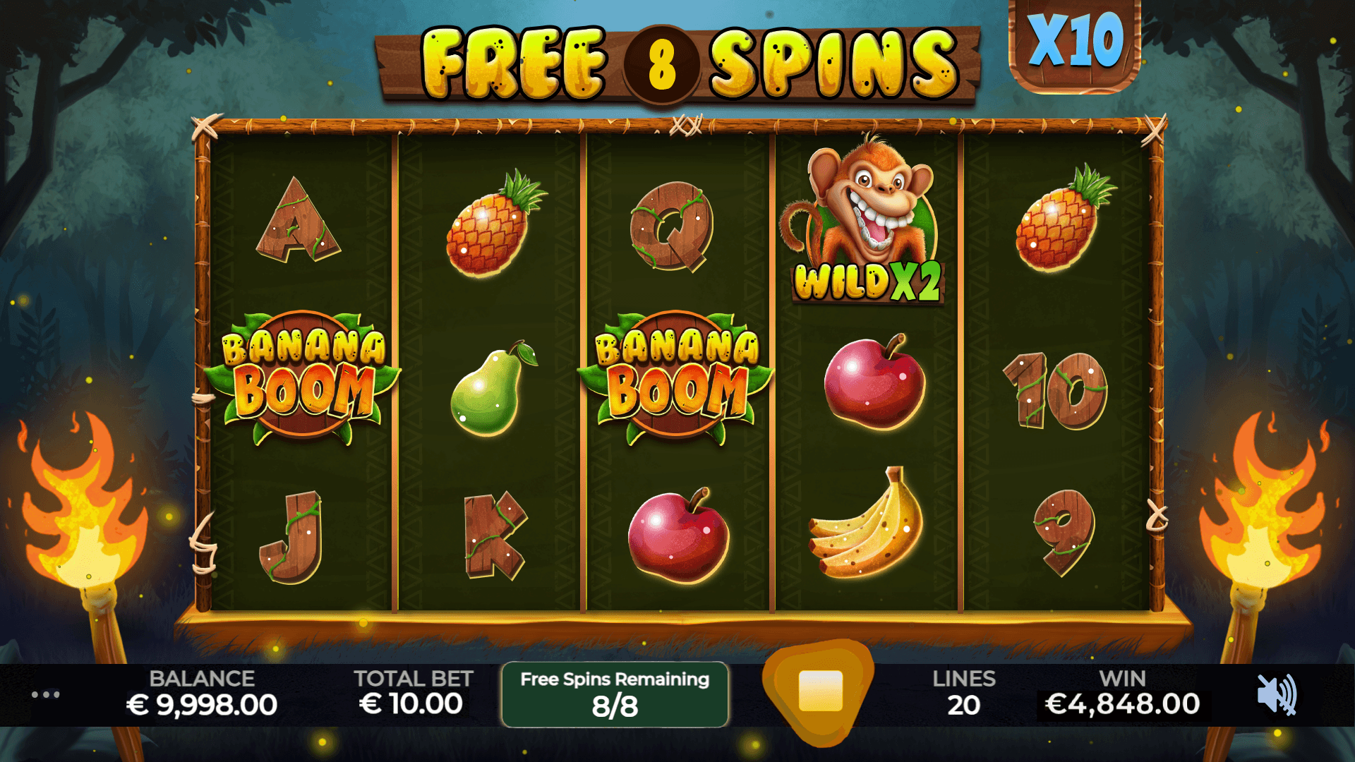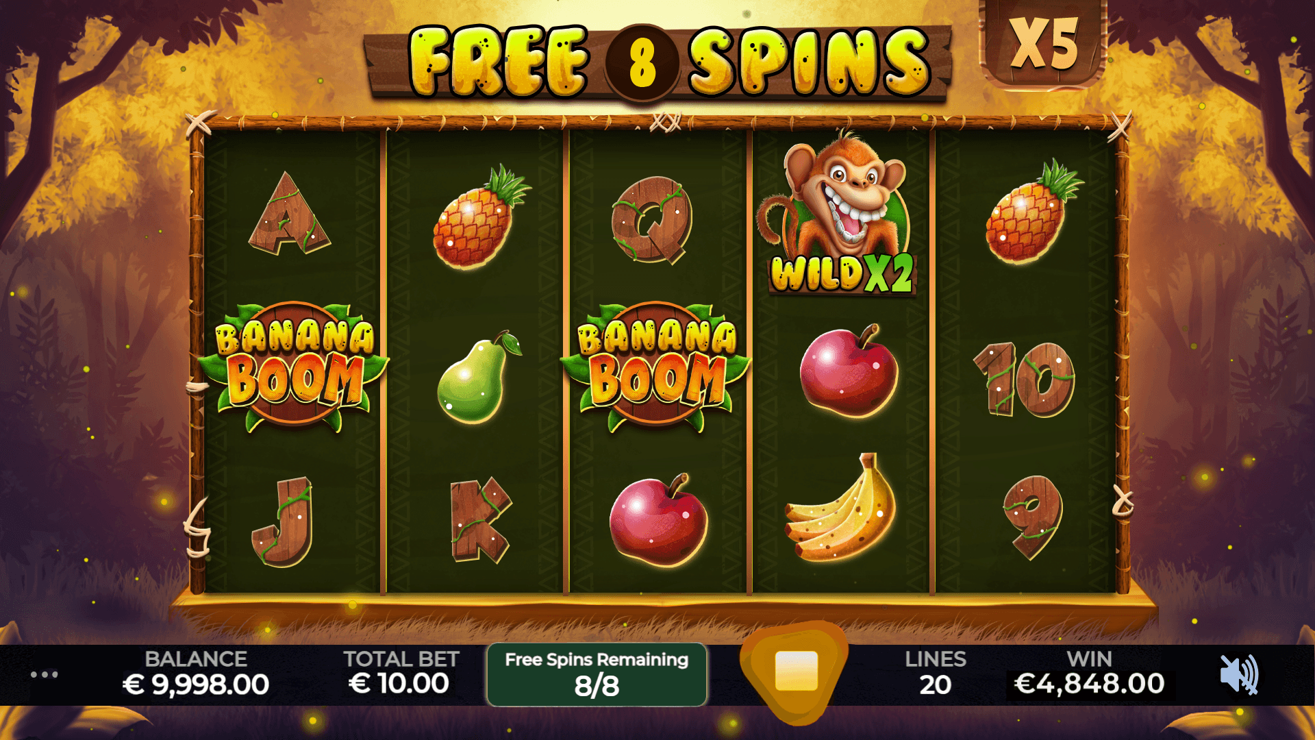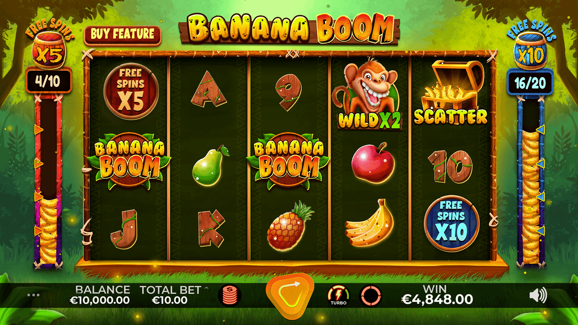 Embark on an unforgettable tropical adventure with Banana Boom, an electrifying slot game that puts a crazy monkey in the spotlight! Collect red and blue banana barrels to accumulate enough bananas and enter the Free Spins rounds with 5x and 10x multiplier, or collect 3 or more banana chest symbols to instantly enter the Free Spins with a 2x multiplier. With its frequent occurrence of Free Spins bonuses, each one multiplying with a different multiplier, every spin is a potential jackpot opportunity. Plus, the wild symbol doubling your winnings makes Banana Boom prizes even more spicy and volatile. Let the monkey lead you to a world of endless rewards and entertainment like no other!