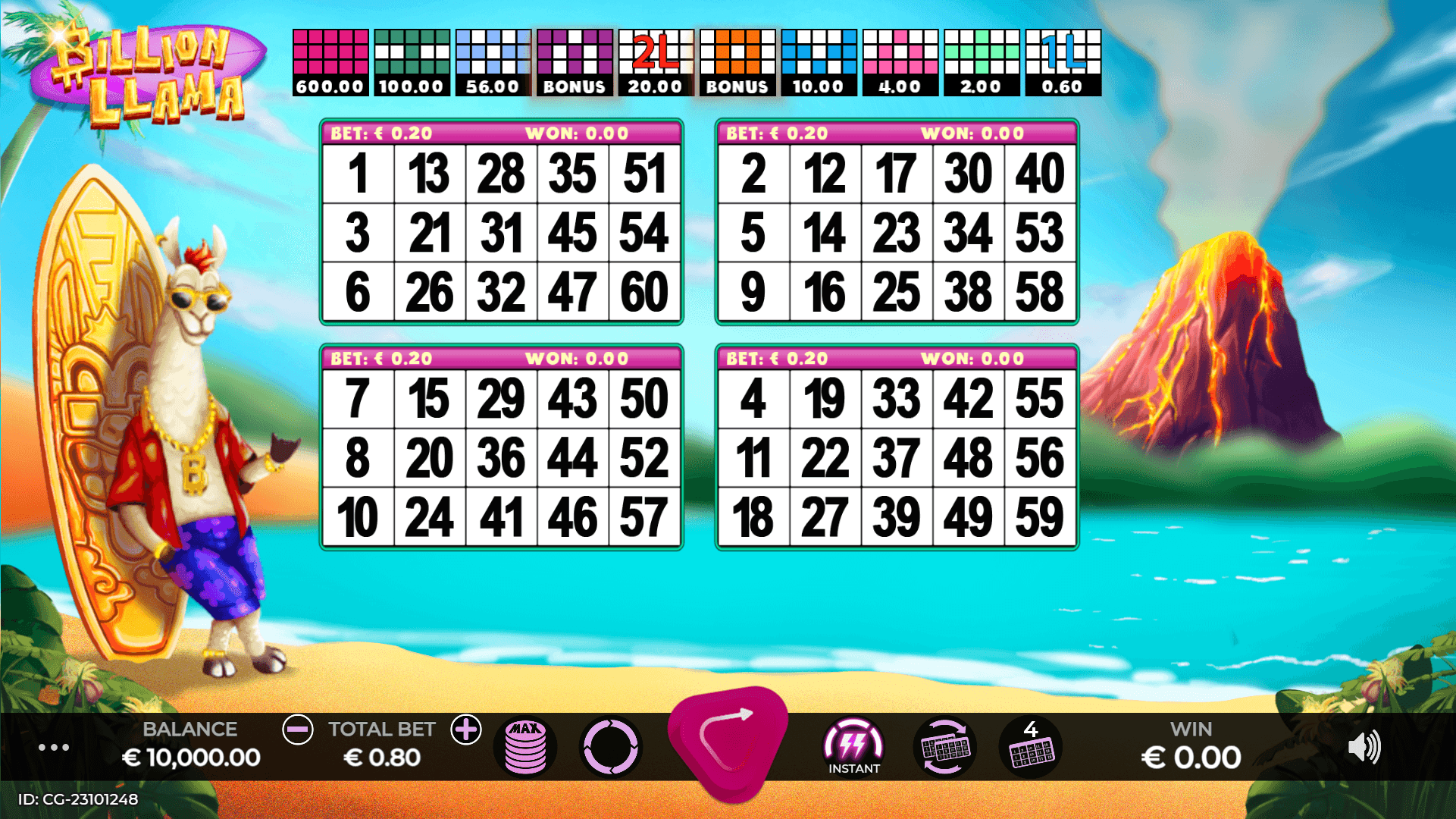 He's wealthy. He's lucky. Join Billion Llama, our newest hero, on adventures around the globe, starting on a sunny vacation in Hawaii. Buy extra balls coming from an active volcano to boost you odds to win big. Enjoy bonuses to avoid sharks and collect as many prizes you can. Huge prizes are waiting for you on Caleta's Billion Llama Bingo!