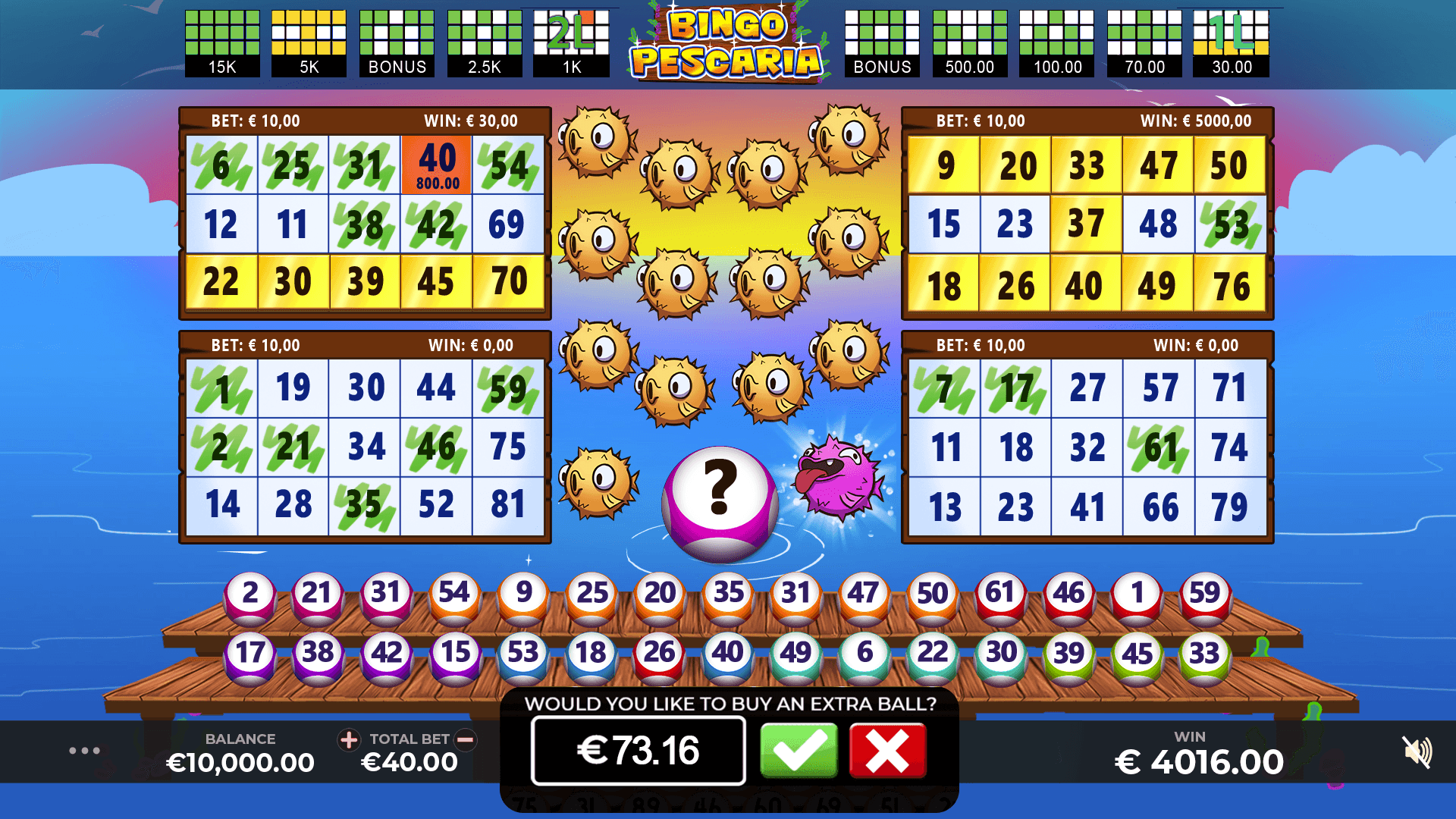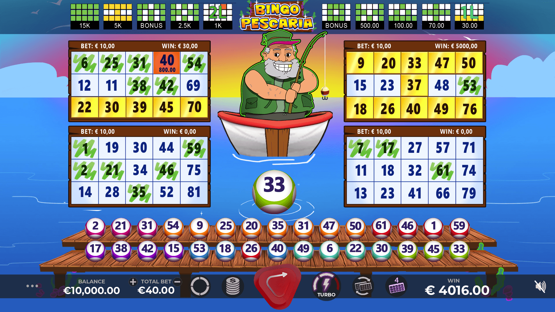 Ernest is back in Bingo Pescaria and he is aiming to catch even bigger fishes! Hit the bonus pattern to go through the electrifying Fishing Bonus or hit the Bingo pattern to win a fenomenal prize of 1500x the bet. Are you ready to join the Captain and catch the biggest prizes of the ocean?