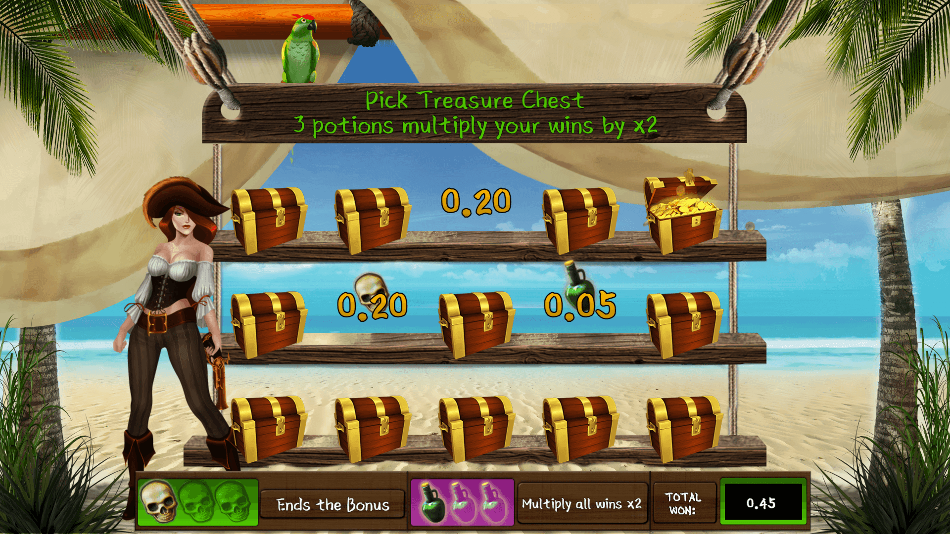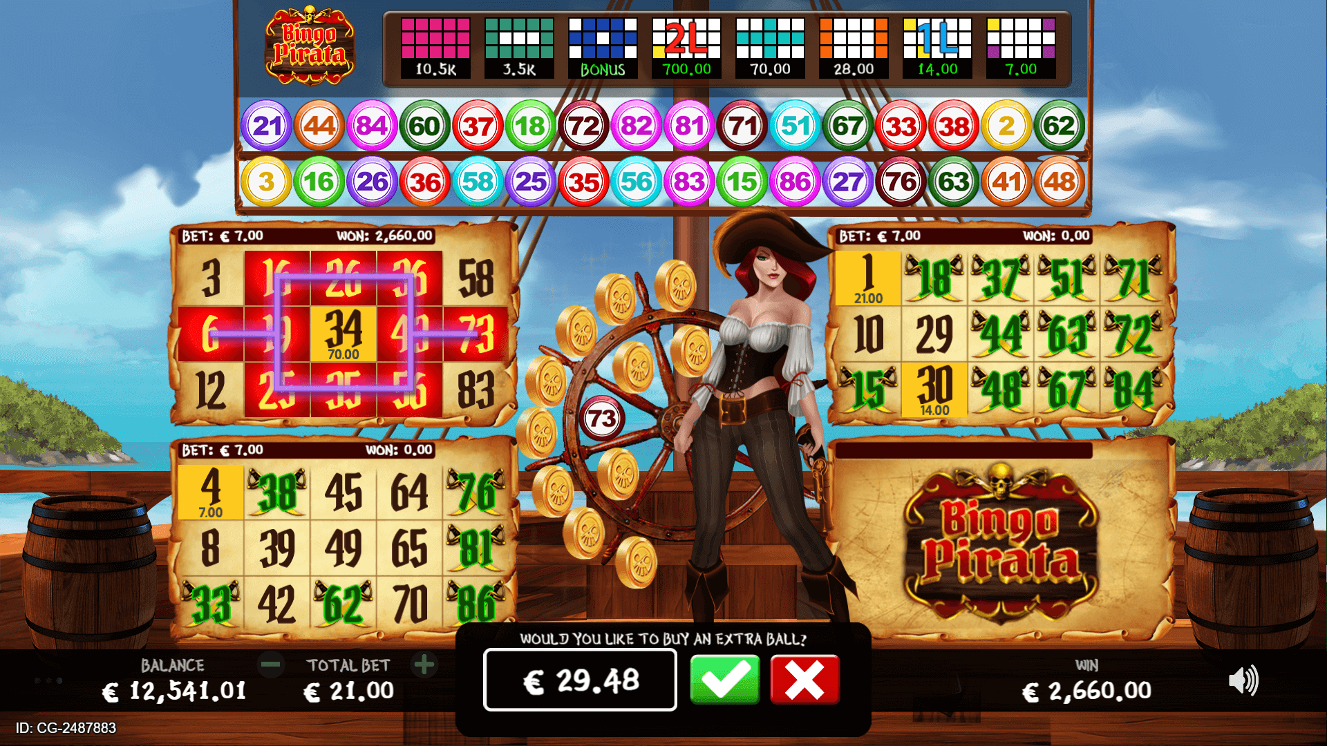 Yo ho ho and a bottle of rum. Who dare come on board the Pirate ship and win some treasure? Bingo Pirata offers a Jackpot of Gold, even more Gold in the treasure chest bonus game and with the Parrot flying away try and get through more wins on the Extar Balls.