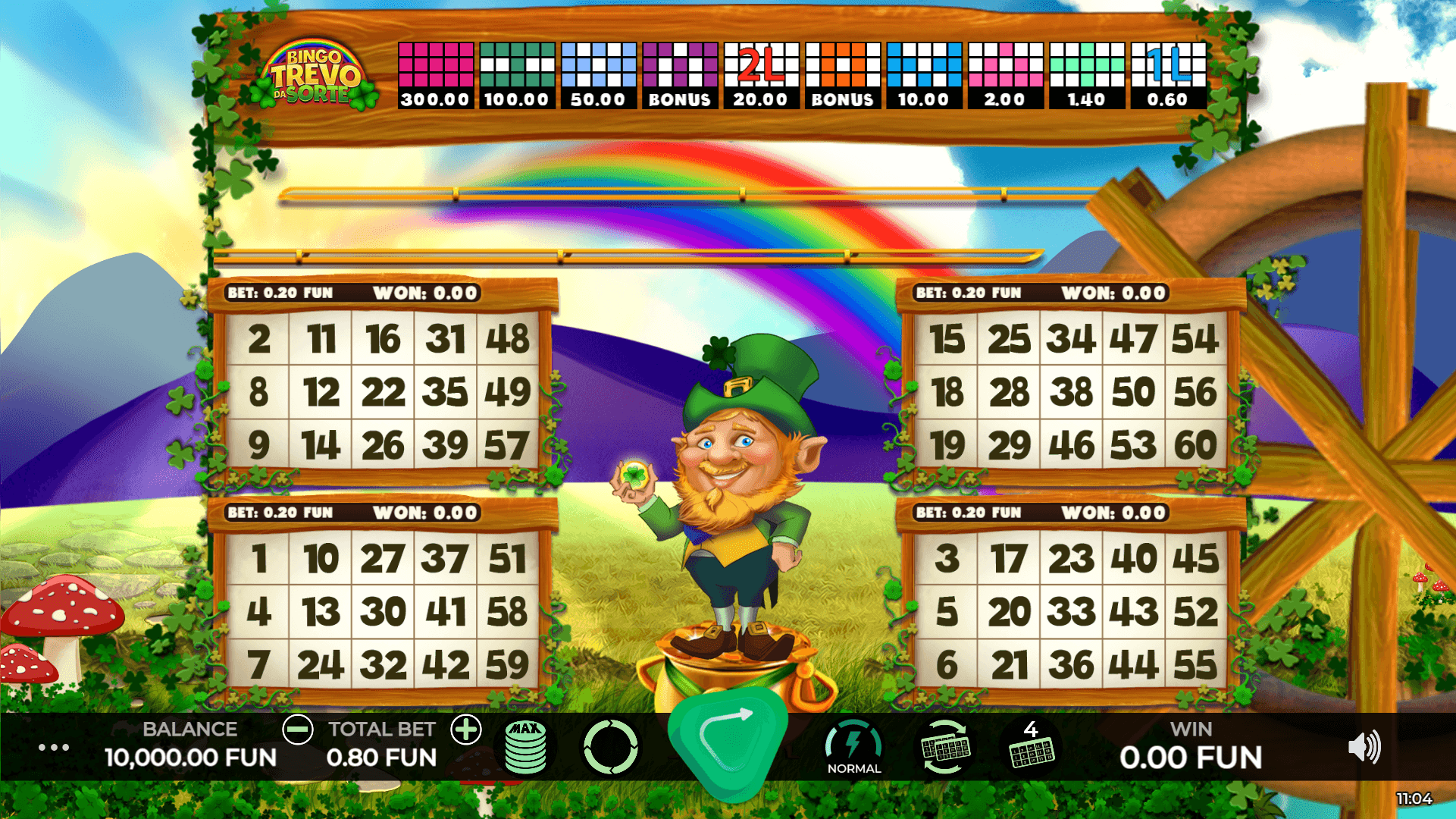 Bingo Trevo da Sorte brings you everything you need in a Bingo game. 2 stunning bonus games taking you on an exciting journey on the Path of Gold and if that wasn't good enough, if the luck is with you, you will be able to pick a Pot of Gold. The lucky Leprecheun will be with you as you play this fast paced game. Don't blink and miss out!