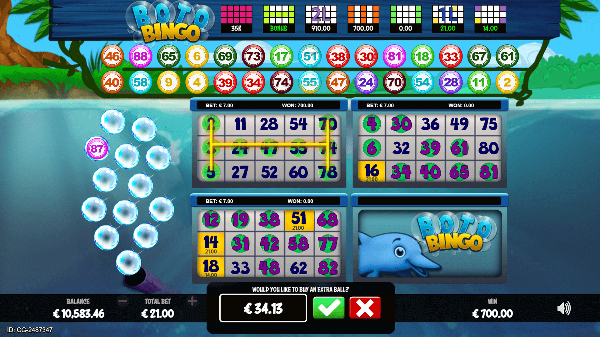 In this online bingo variant, huge quantities of twists will wash up onto shore for you in no time at all courtesy of Boto the friendly dolphin, with 4 bingo cards, 30 regular balls, and up to 13 extra balls. With a little luck, the winnings will really get flowing!