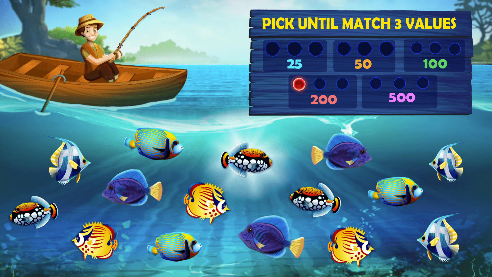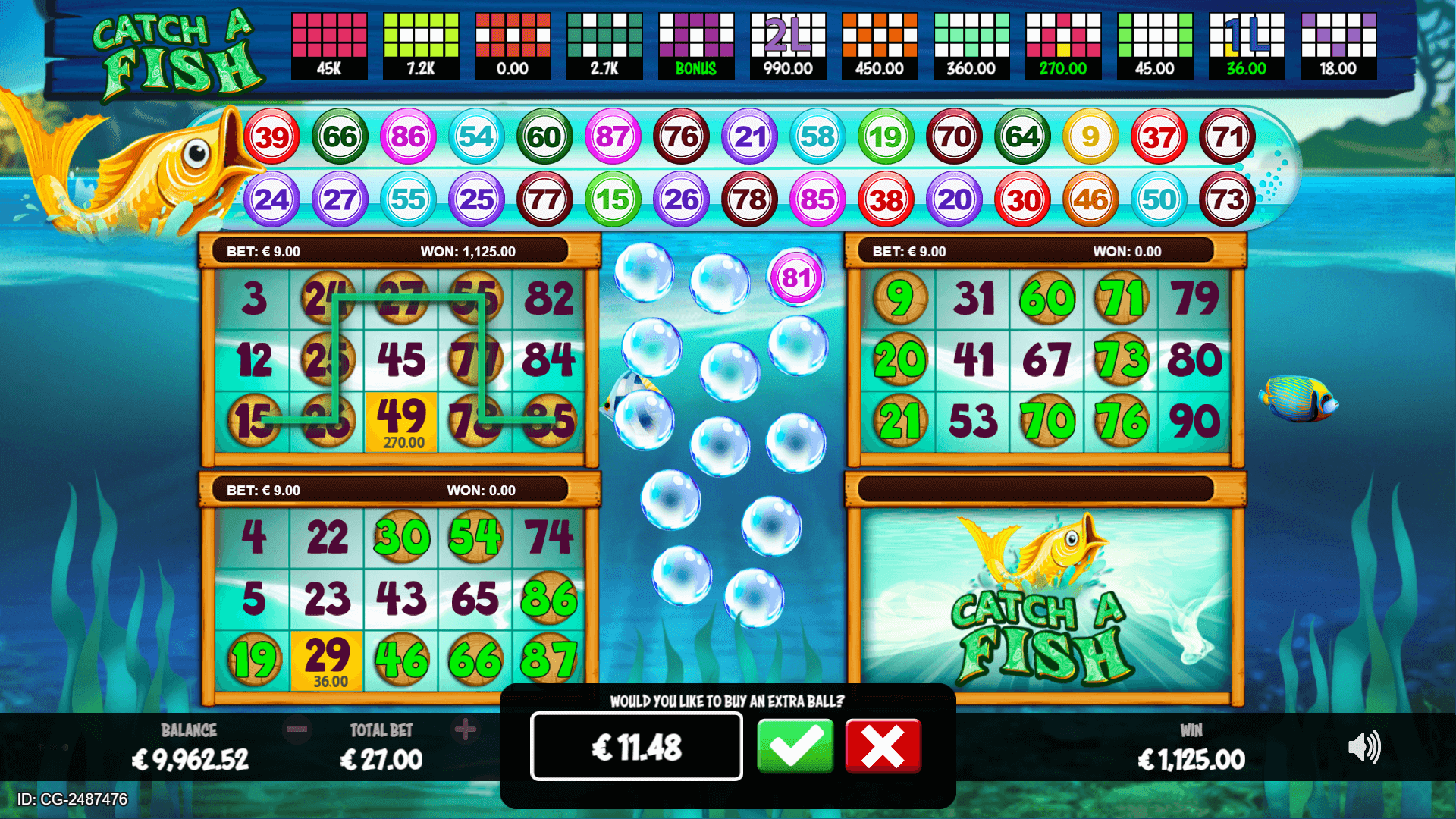 The river is full of prizes in Catch a Fish! Get settled in your boat and use the extra ball bubbles to fish a Bingo! At the bonus game, pick the best fishes and hook a lot of winnings. Are you ready? Then prepare your fishing rod and come enjoy this river of cash.