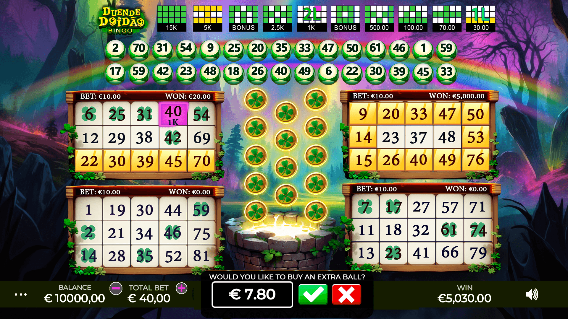 Feeling lucky? In Crazy Clover Bingo, the leprechaun might reward you with a chance to win his Pots of Gold, or maybe even take you on a stroll on his Crazy Path, where you can benefit from incredible prizes! With amazing features and vibrant gameplay, you’re sure to have fun on this exciting journey.