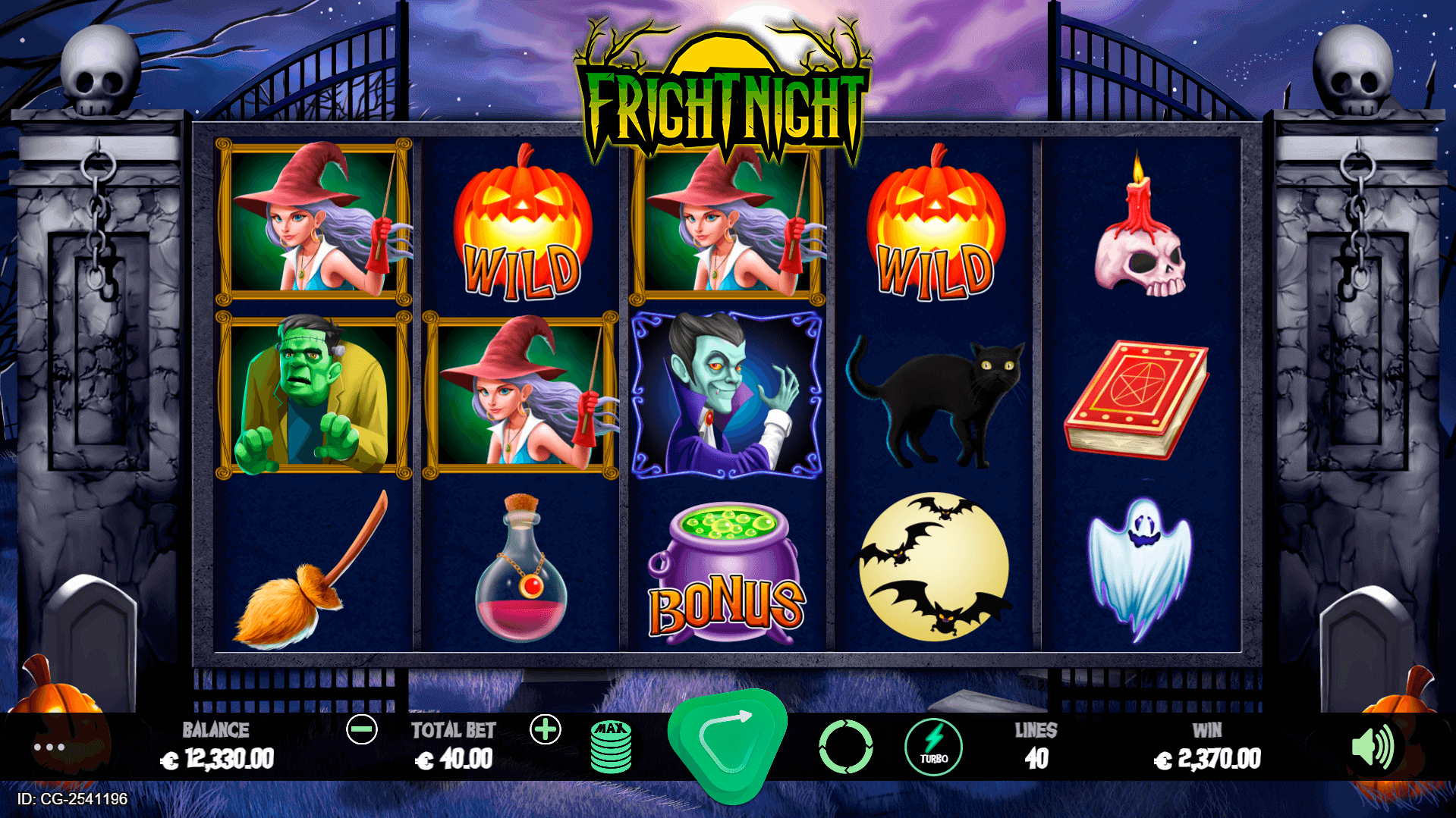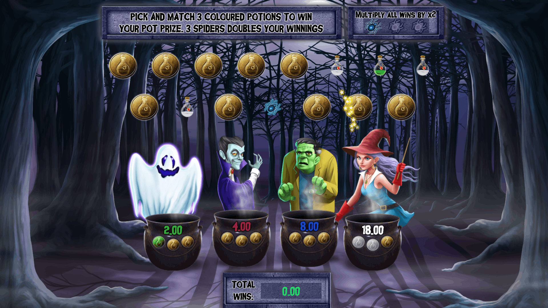 Keep the lights on!! This is one scary Slot that is giving away frighteningly big bonuses! Set at the dead of night this Slot offers Free Spins, Retriggers and a multiplier Bonus. Pick and match 3 coloured potions to win the Potion Bonus game with Mr Ghoul, Dracula, Frank and Wendy the Witch. Get the Lucky Spiders to double your winnings.