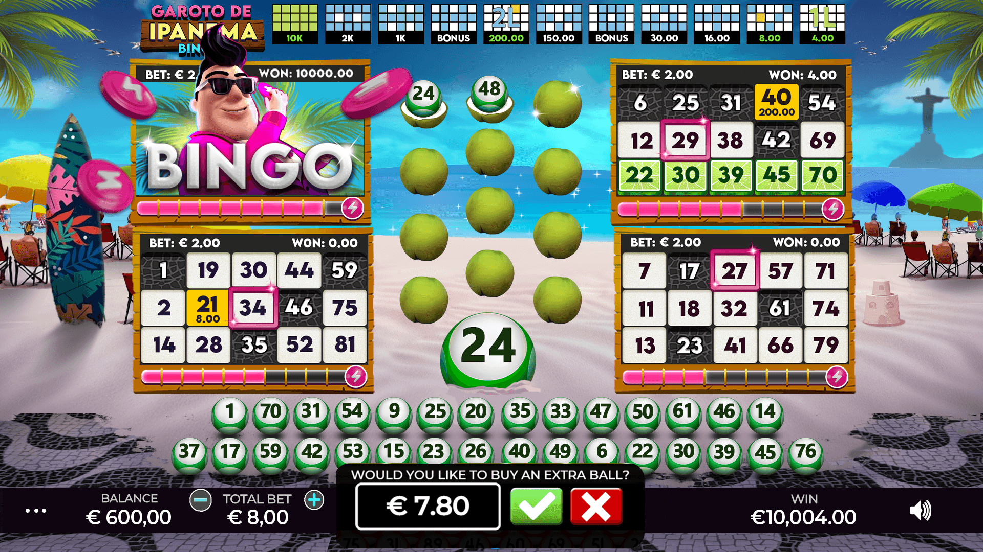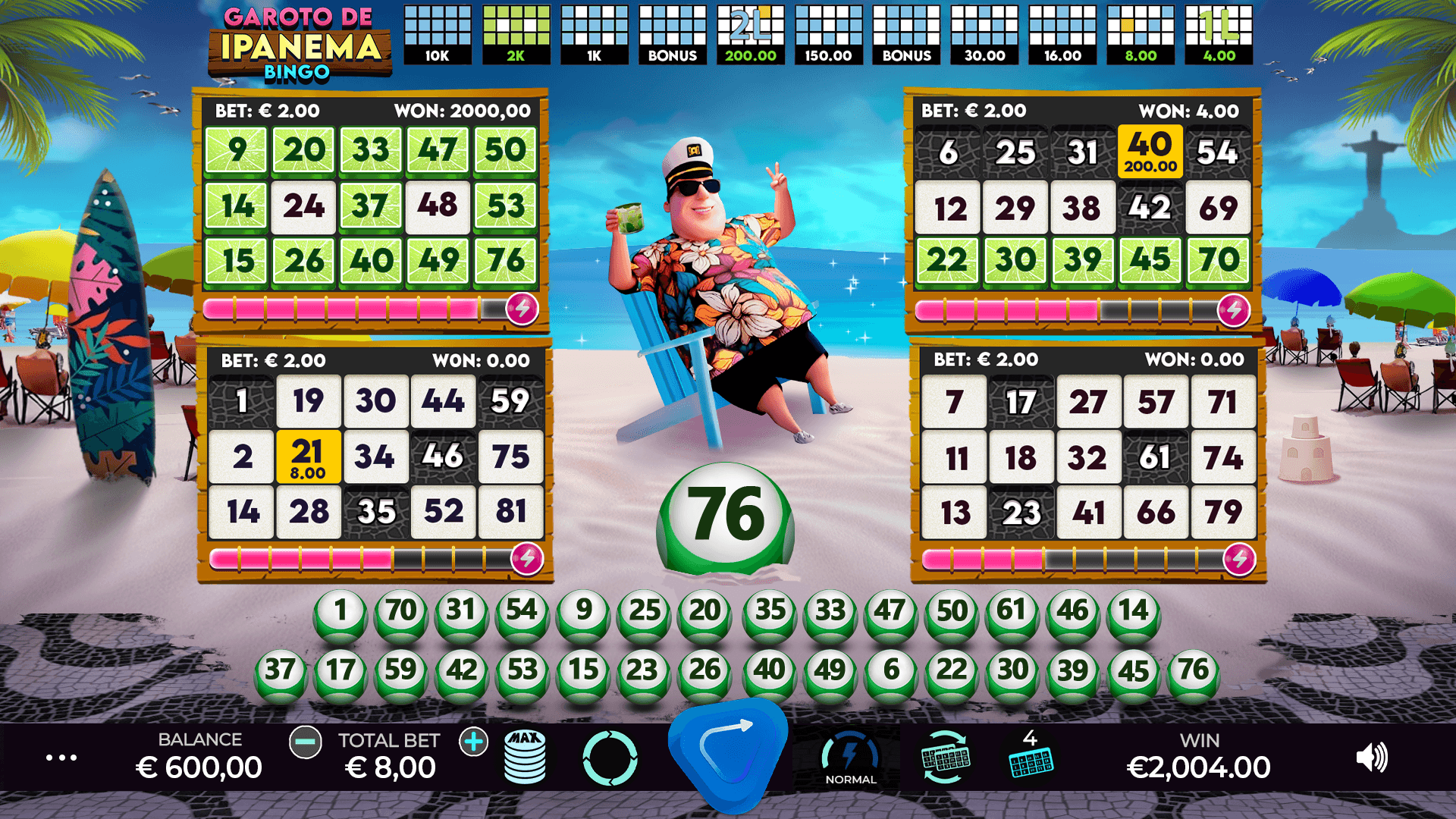Garoto de Ipanema Bingo takes FTN's charismatic character Mr. First on a trip to the beautiful city of Rio de Janeiro. It's unique visuals and fun mechanics make for a very charming and engaging experience. Go to a soccer match at the legendary Maracanã stadium and win great prizes during the bonus round. Visit amazing sights like Arcos da Lapa and Christ the Redeemer. Have fun joined by your travelling companion Mr. First in this exciting game.