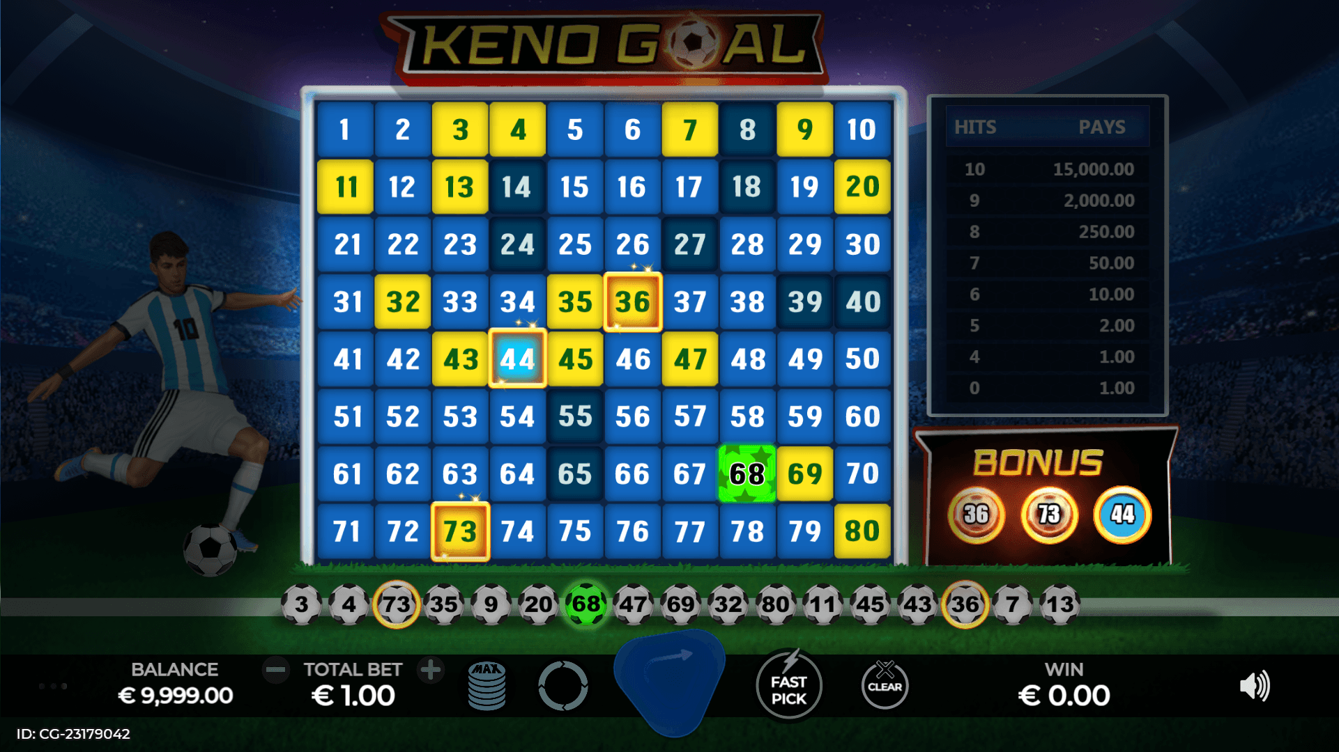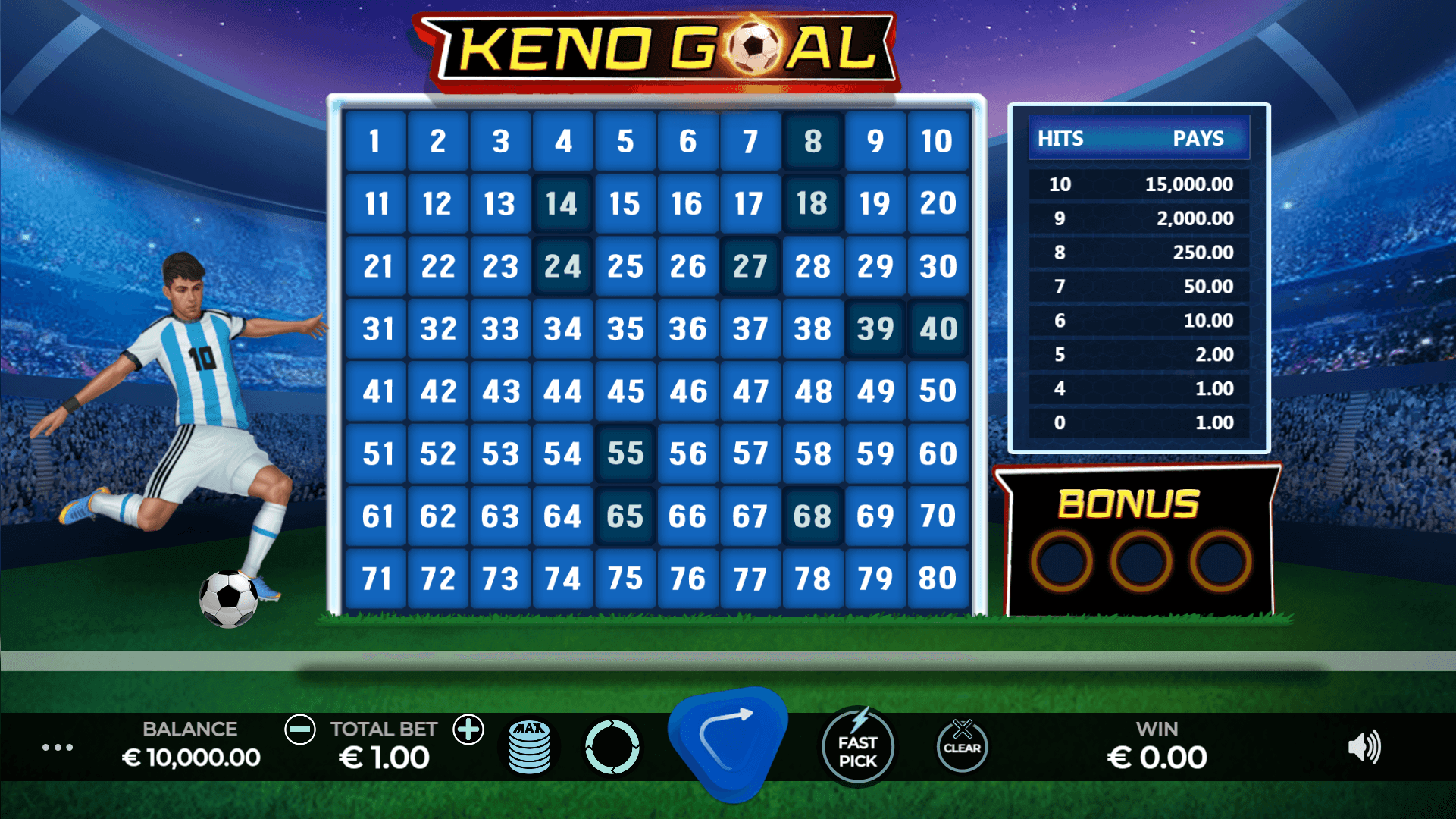 It's goal time! Make the net shake with our new keno game, in which you can win glorious prizes! Hit the 3 Lucky Numbers to enter the Penalty Bonus and show you're the best player in the world!