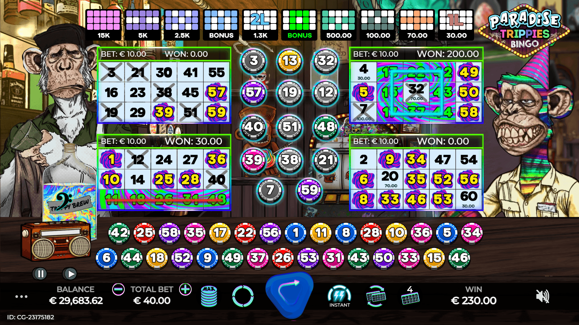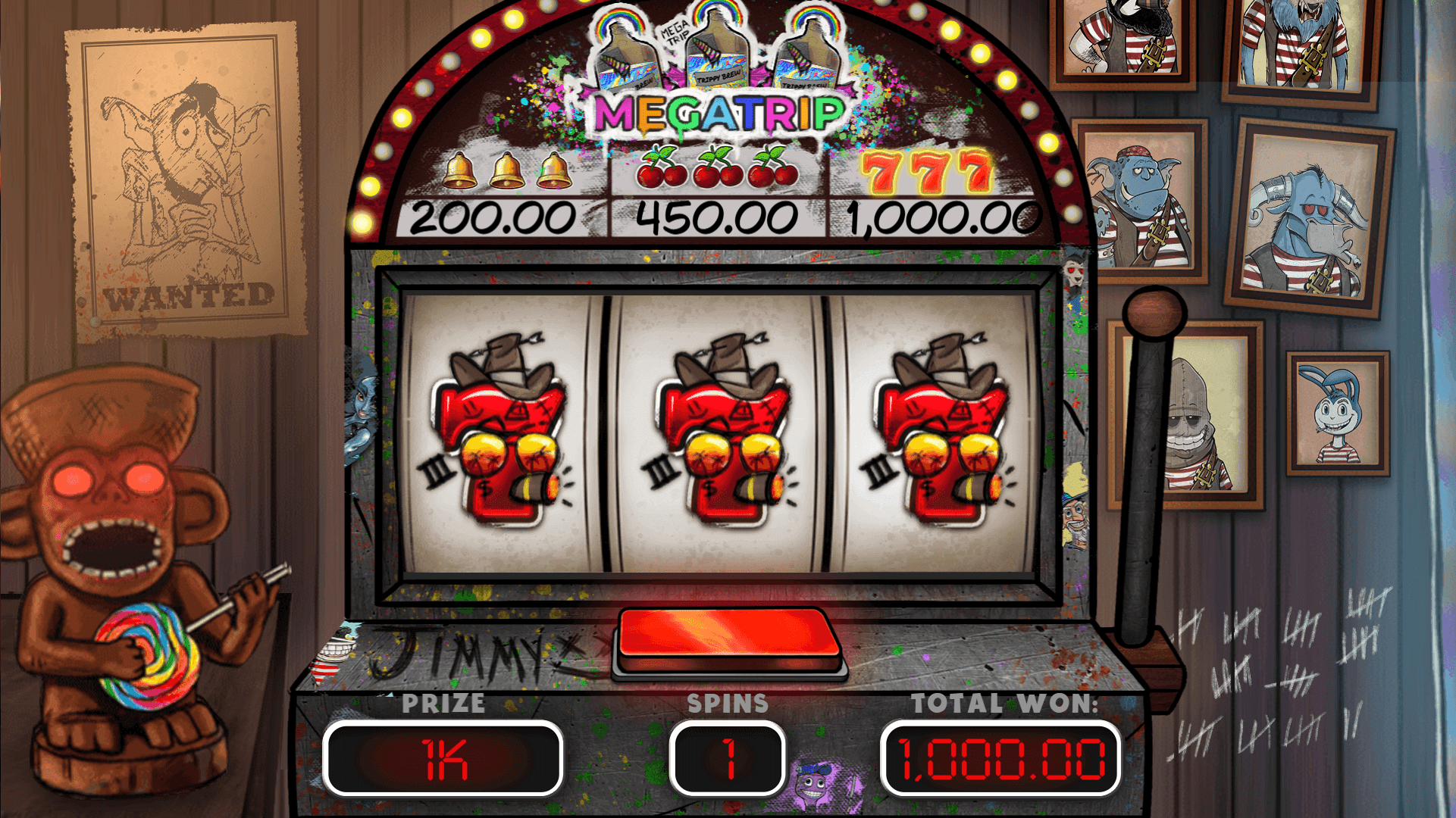 Party Pete awaits you to join him and his friends in this new bingo experience. Show off your skills in the Trippy Contest Bonus, try your luck at the Jimmy F'Slot Bonus and get a taste of Paradise in the Mega Trip Bonus. For an extreme trippy adventure, buy up to 14 extra balls to boost your chances of winning big. Come crack a cold one with us and let's get Trippy!