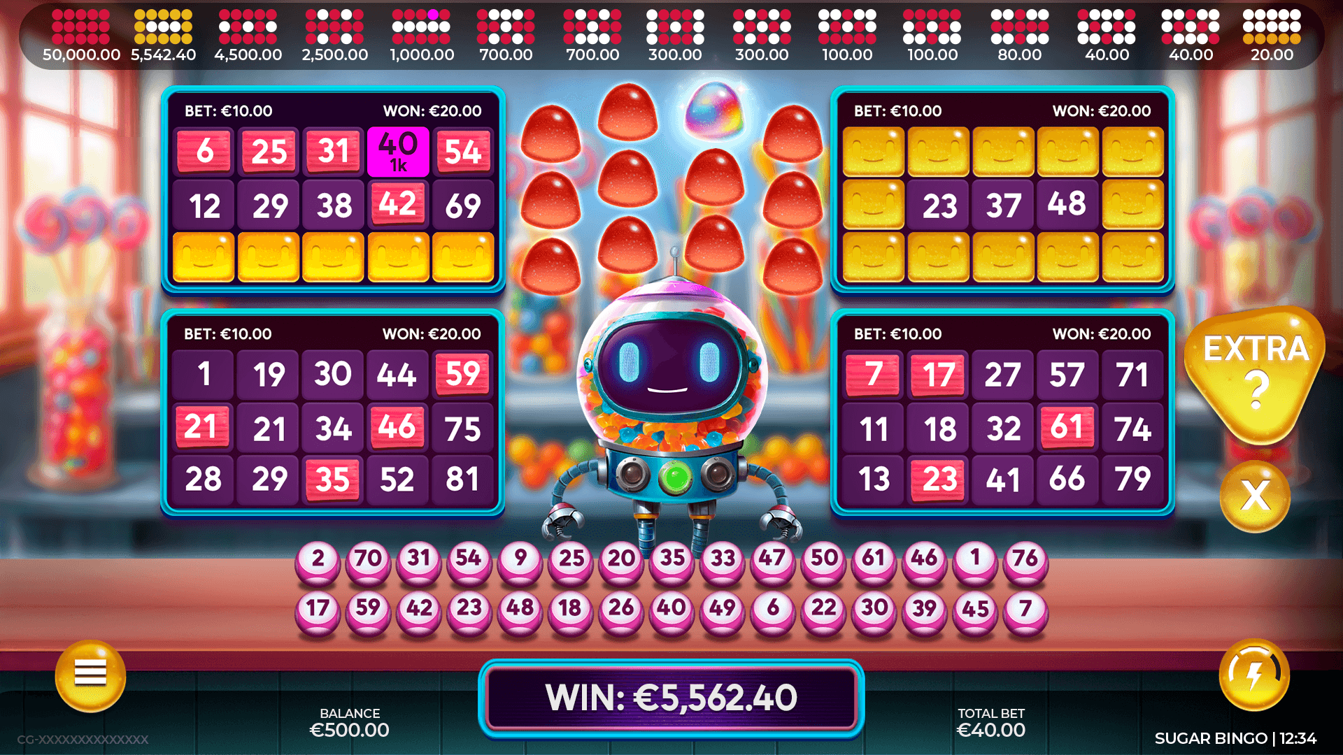 Sugar Bingo is a charming video bingo that transforms a sweet and imaginative candy shop into a delightful adventure. This Caleta release stands out with a new exclusive feature that enhance the thrill of winning: Lucky Picks, offering extra rewards when chosen numbers are drawn. Colorful, playful, and engaging, Sugar Bingo is a captivating title that keeps players entertained and eager for more.