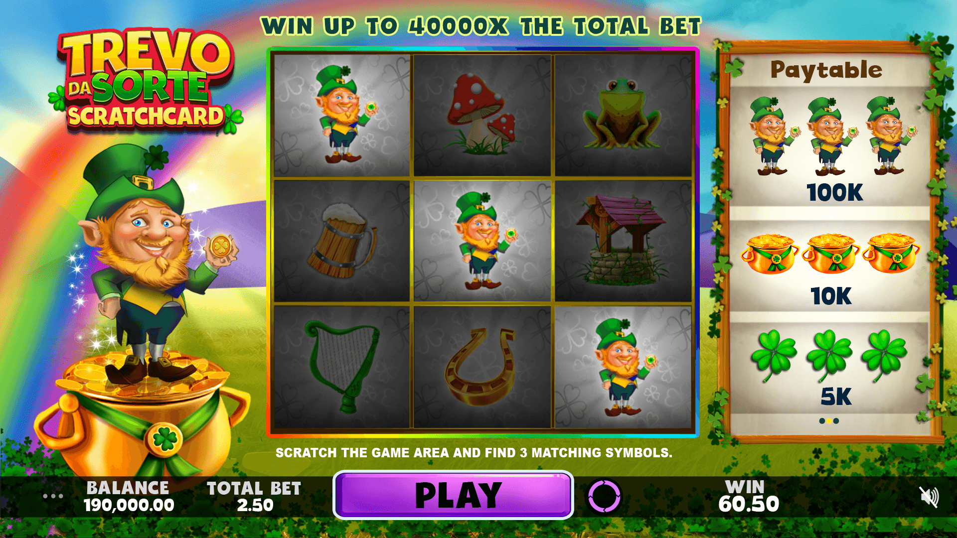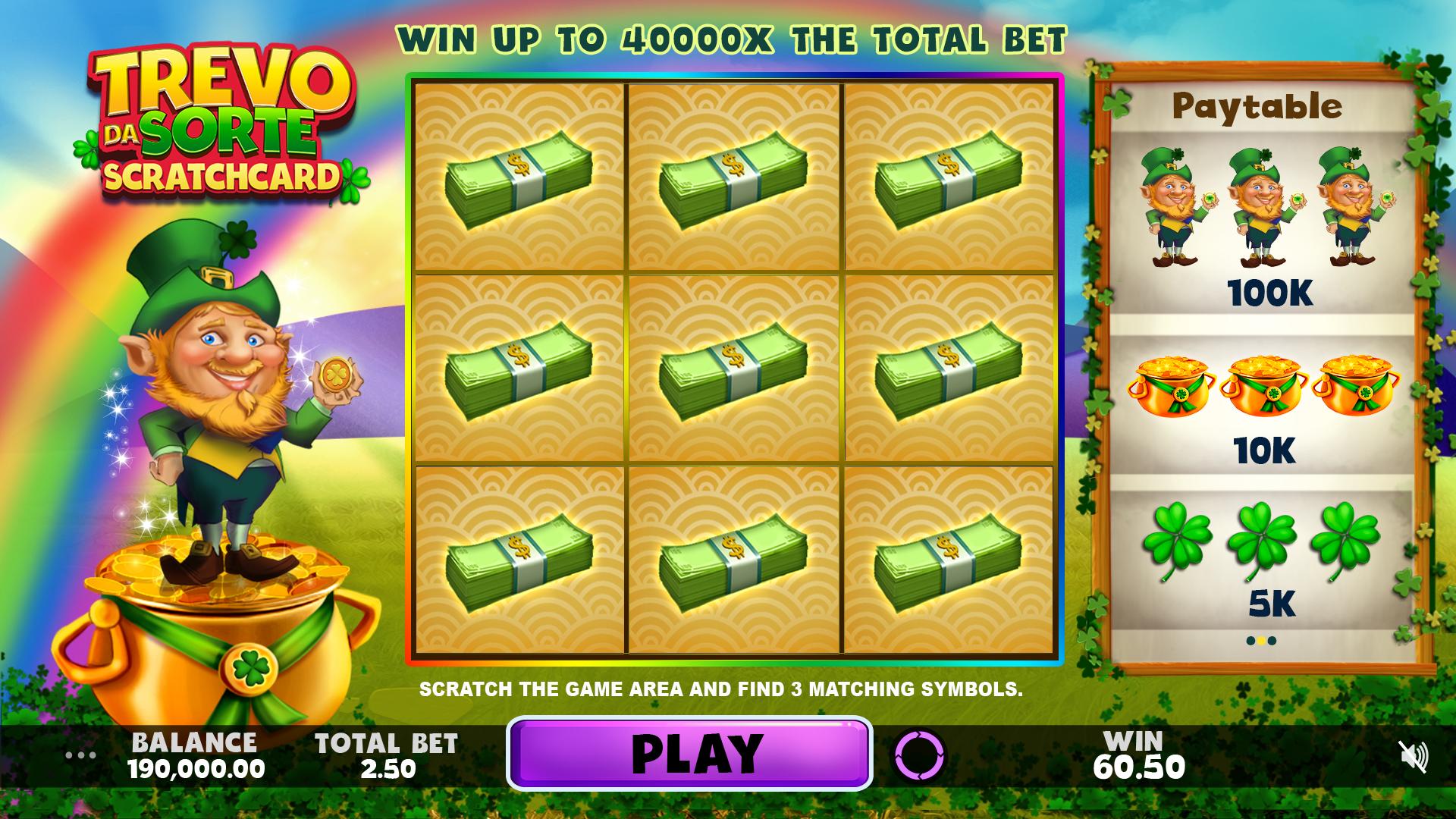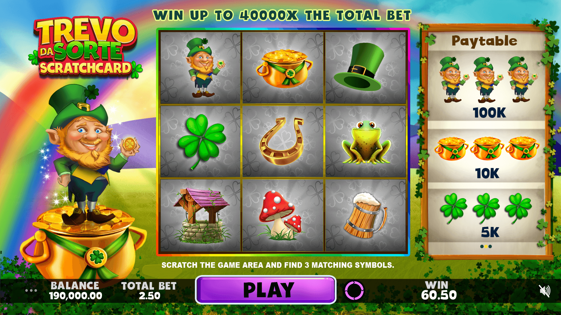 Scratch off the itch of being rich with the Scratchcard Trevo da Sorte and win up to forty thousand times the stake. Go through the rainbow and grab your pot of gold. Find three similar Fantastic symbols to win great prizes. Are you Lucky? So enter this green field and look for the friendly leprechaun and the Big! Good luck.