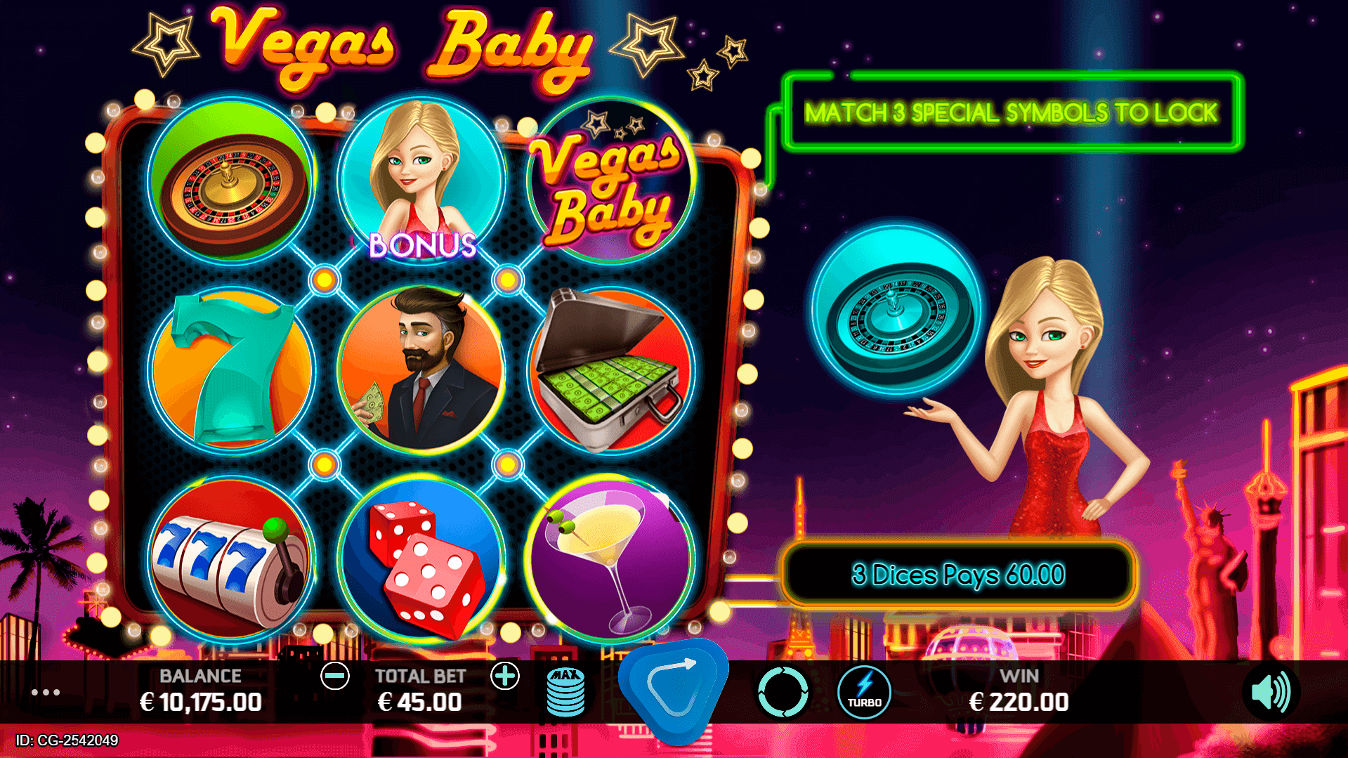 After playing one spin, you will feel like you are in the heart of Las Vegas. Vegas Baby has been created to give you the thrill and feeling of Vegas at the press of a button. A game filled with love, glamour, gambling and of course the Happy Hour Bonus Wheel. At Vegas Baby we never close and may even lock in some symbols for you.