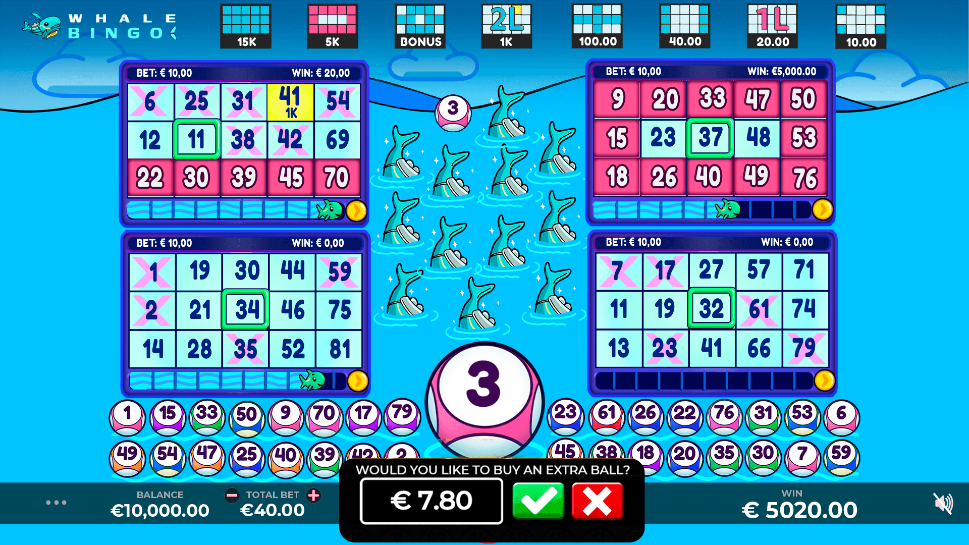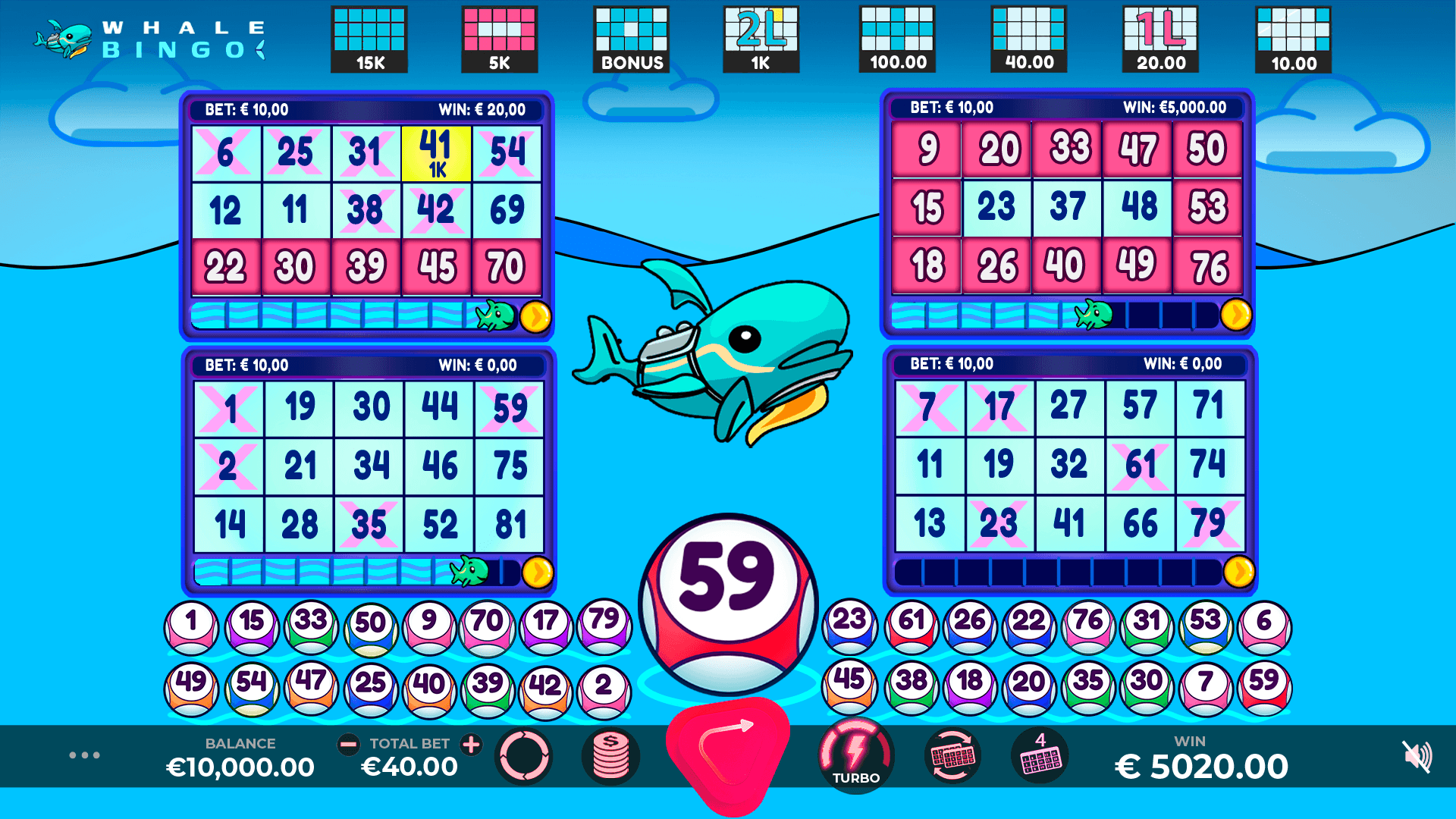 Dive into @whale Bingo, a lavish game that immerses players in the opulent realm of underwater riches. In this thrilling adventure, you'll hunt legendary fortunes alongside majestic whales. With special balls and extra balls, you'll go hunting for huge prizes and accumulate progress to get through to the Whale Splash bonus, where you can win up to 15,000x your bet. With stunning visuals, captivating gameplay, and the allure of massive rewards, @whale Bingo offers an unforgettable gaming experience. Will you conquer the waters and emerge with unimaginable wealth? It's time to dive deep into the adventure and claim your share of the underwater fortune.