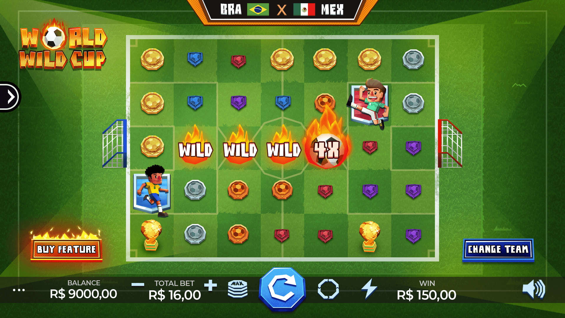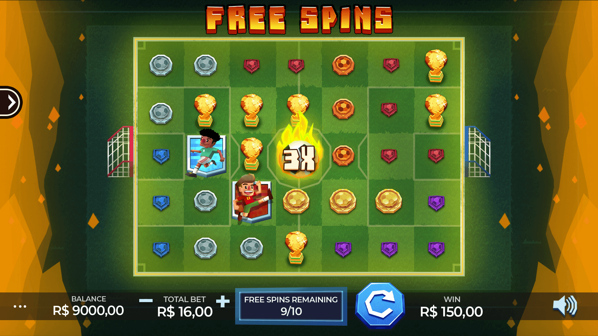 Are you ready for the wildest championship in the world? Join this legendary cluster pays slots game in a perfect custom football match! The Flaming Ball is your greatest ally in this action-packed game – when football players kick it, it leaves a long trail of flaming Wilds, wiping symbols on the field and leading to huge wins. Scoring a goal triggers the Free Spins Championship, in which the Flamming Ball builds up its multiplier to massive levels without ever extinguishing its flames. The judge is also a great partner in this match, as he drops a flaming card resulting in a random number of wilds whenever he appears on the field. Put on your best cleats and get ready to be a wild champion!
